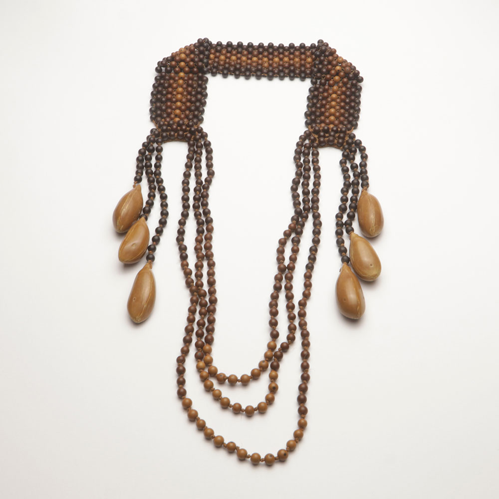 O Colar Inajá apresenta diferentes técnicas artesanais na mesma peça: trançado com sementes, crochê, técnica do nozinho (empregada na feitura de colares de pérola), tingimento naturais na linha e açaí, polimento do açaí e inajá. Capacitação e versatilidade no uso dos elementos da floresta - características da Oficina-Escola Linha do Tucum!
