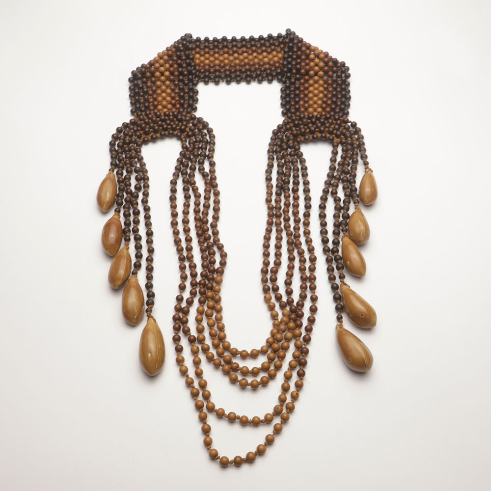 O Colar Inajazão é uma peça imponente que combina trançado de semente com tingimento natural em dégradé, voltas com a técnica do nozinho (utilizada em colares de pérola), sementes inajás impecavelmente polidas e acabamentos em crochê. Essa peça, como toda a coleção, faz parte do importante trabalho socioambiental desenvolvido com famílias que vivem na floresta Amazônica.